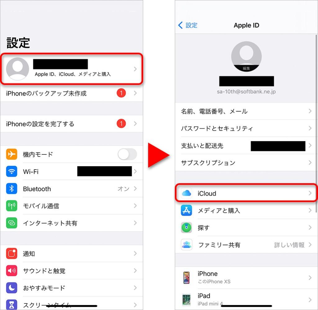 (1)設定画面から「Apple ID、iCloud、~」をタップ。続いて「iCloud」を選択する