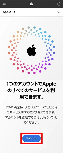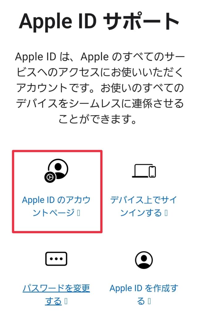 (5)「Apple ID サポート」のページを開き、「Apple ID アカウントページ」をタップ。
