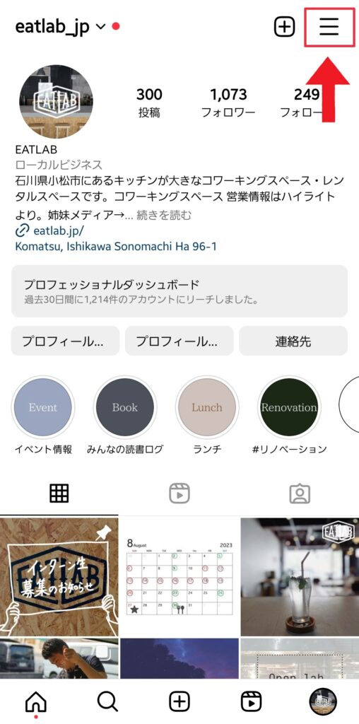 (1)Instagramのアプリを開き、右下のアイコンを押してプロフィールを表示する。