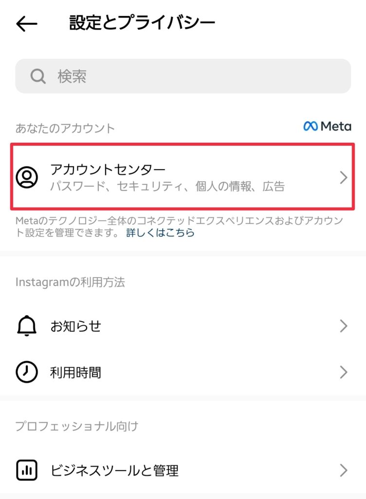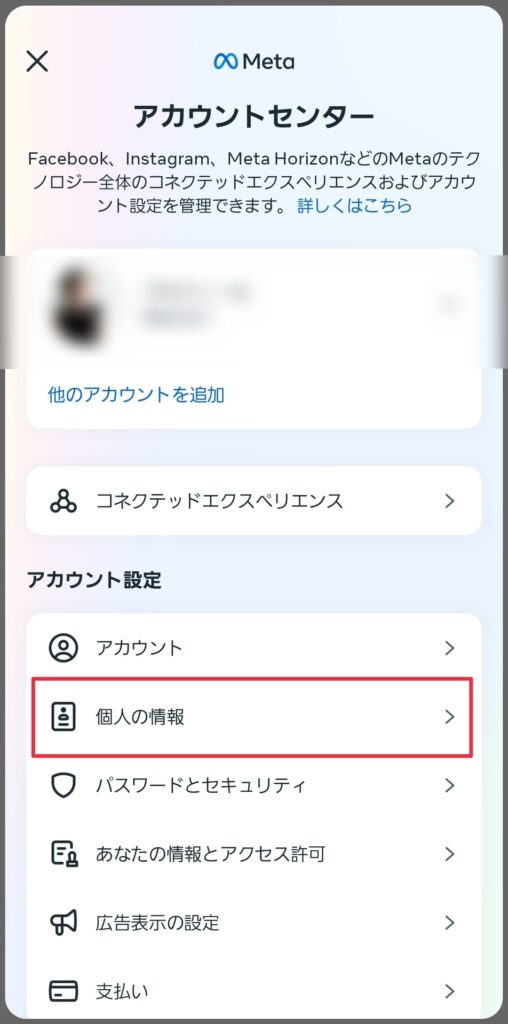 (3)「アカウントセンター」をタップ、次に「個人の情報」をタップし、メールと電話番号の項目を確認し、情報が古くなってないか確認する。