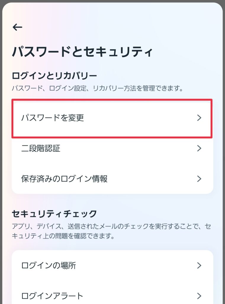 (5)「設定」項目に戻り、「パスワードとセキュリティ」をタップ、続けて「パスワードを変更」をタップ。