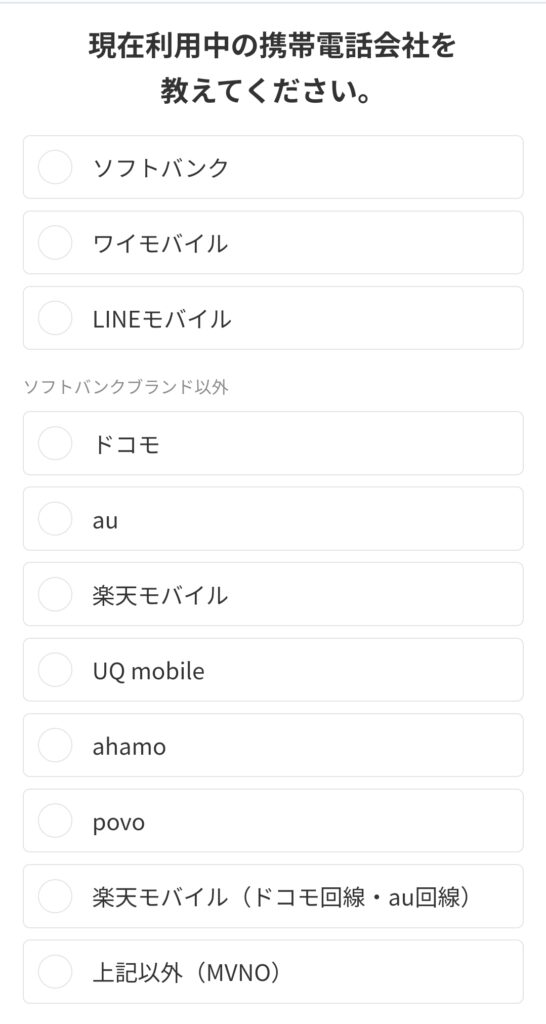 (4)「現在利用中の携帯電話会社を教えてください」で「ソフトバンク」または「ワイモバイル」を選択