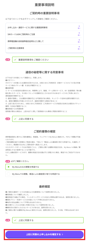 (15)重要事項にチェックを入れていき「上記に同意の上申し込みを確定する」をタップ