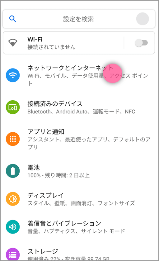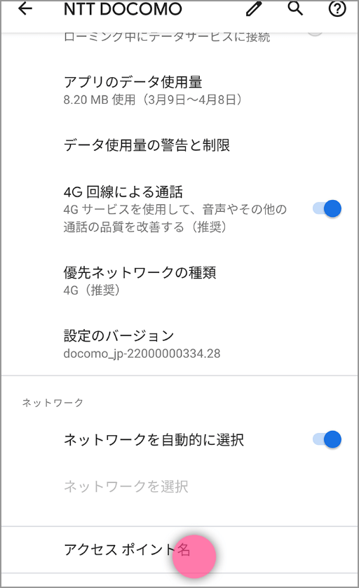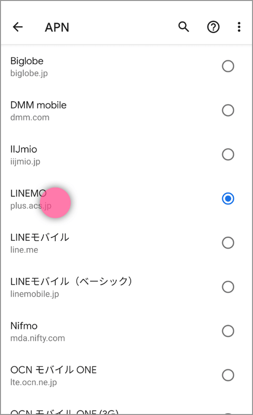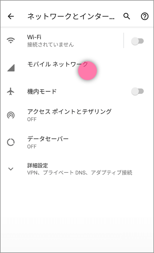 Android→「設定」>ネットワークとインターネットの設定画面(端末によって画面名は異なる)>「モバイルネットワーク」>「アクセスポイント名」>「LINEMO」