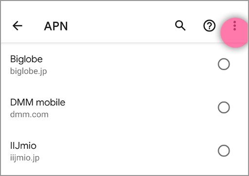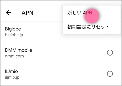 APN一覧にLINEMOがない場合、APN一覧画面でメニューから「新しいAPN」を選択