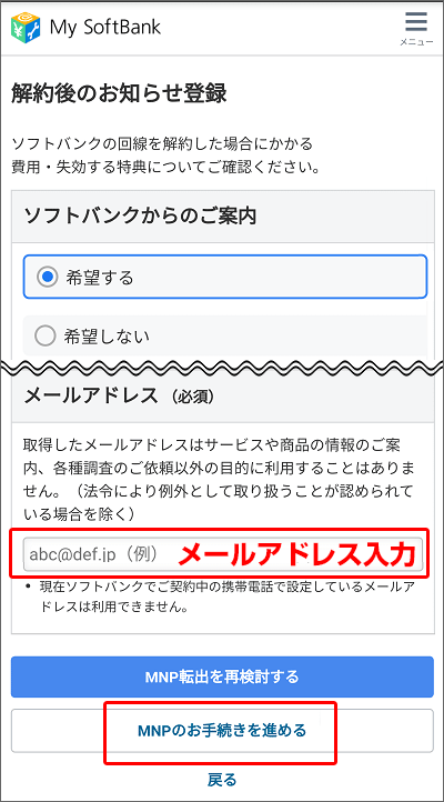 (3)メールアドレスを入力し、「MNPのお手続きを進める」をタップ