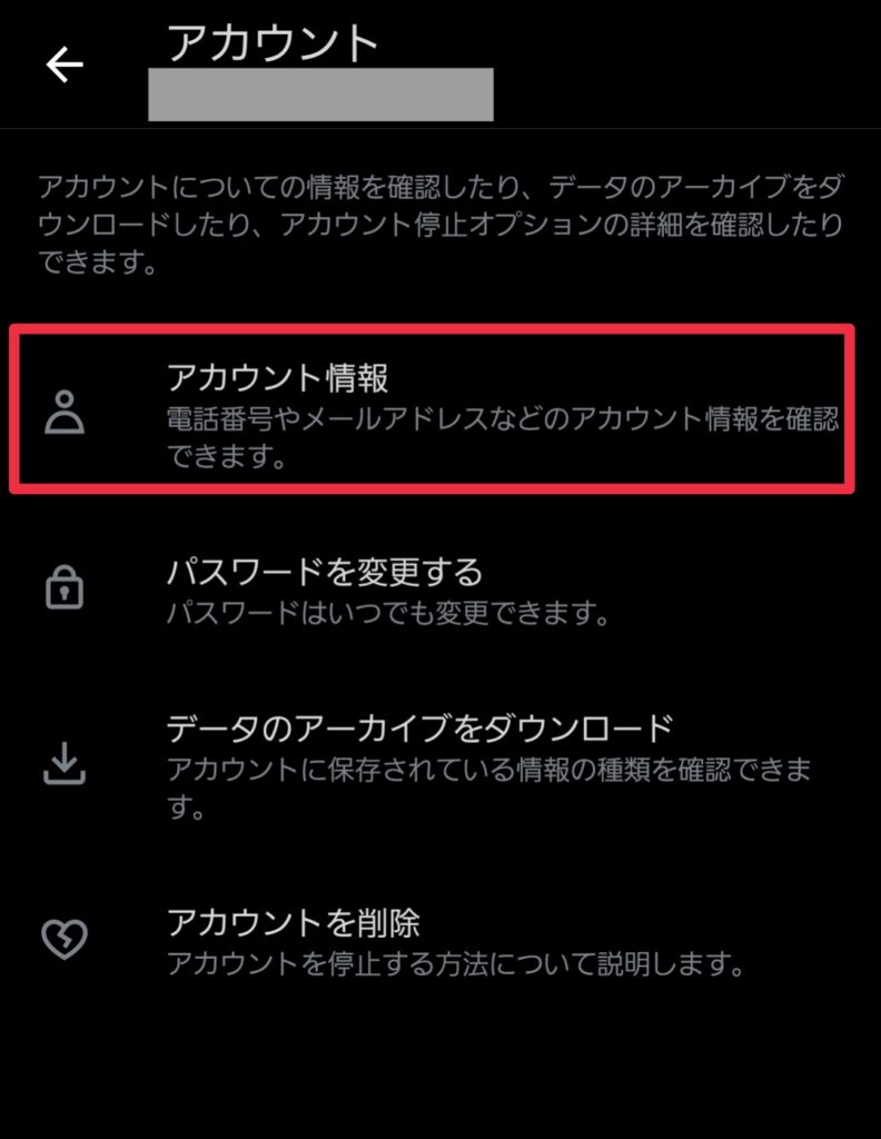 (6)「アカウント」→「アカウント情報」をタップし、携帯電話とメールの項目をチェックし、古くなっていないか確認する。